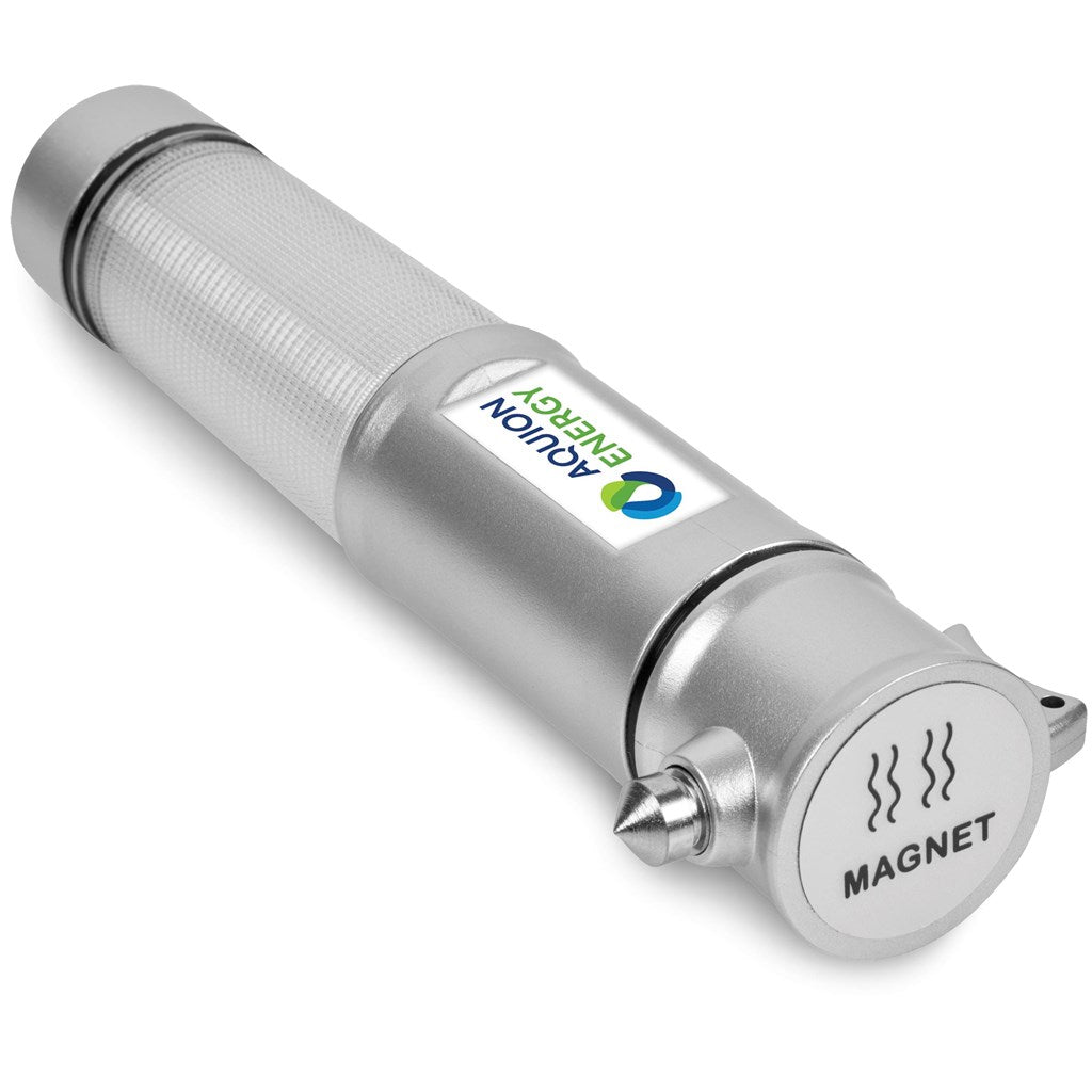 Stay prepared in a case of emergency with our handy emergency light. Features: white LED light: 18 000 MCD : emergency beacon with red flashing LED lights : safety-belt cutter :break-glass safety hammer : magnets on base allow torch to be attached to vehicle when flashing light is in use: 2 x AA batteries included • ABS: 19.3 ( h ) x 3.5 ( dia )