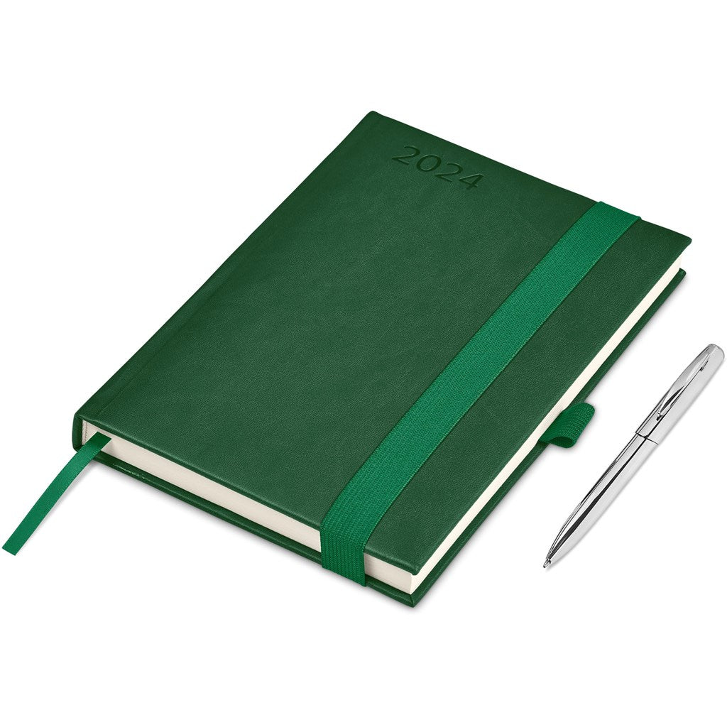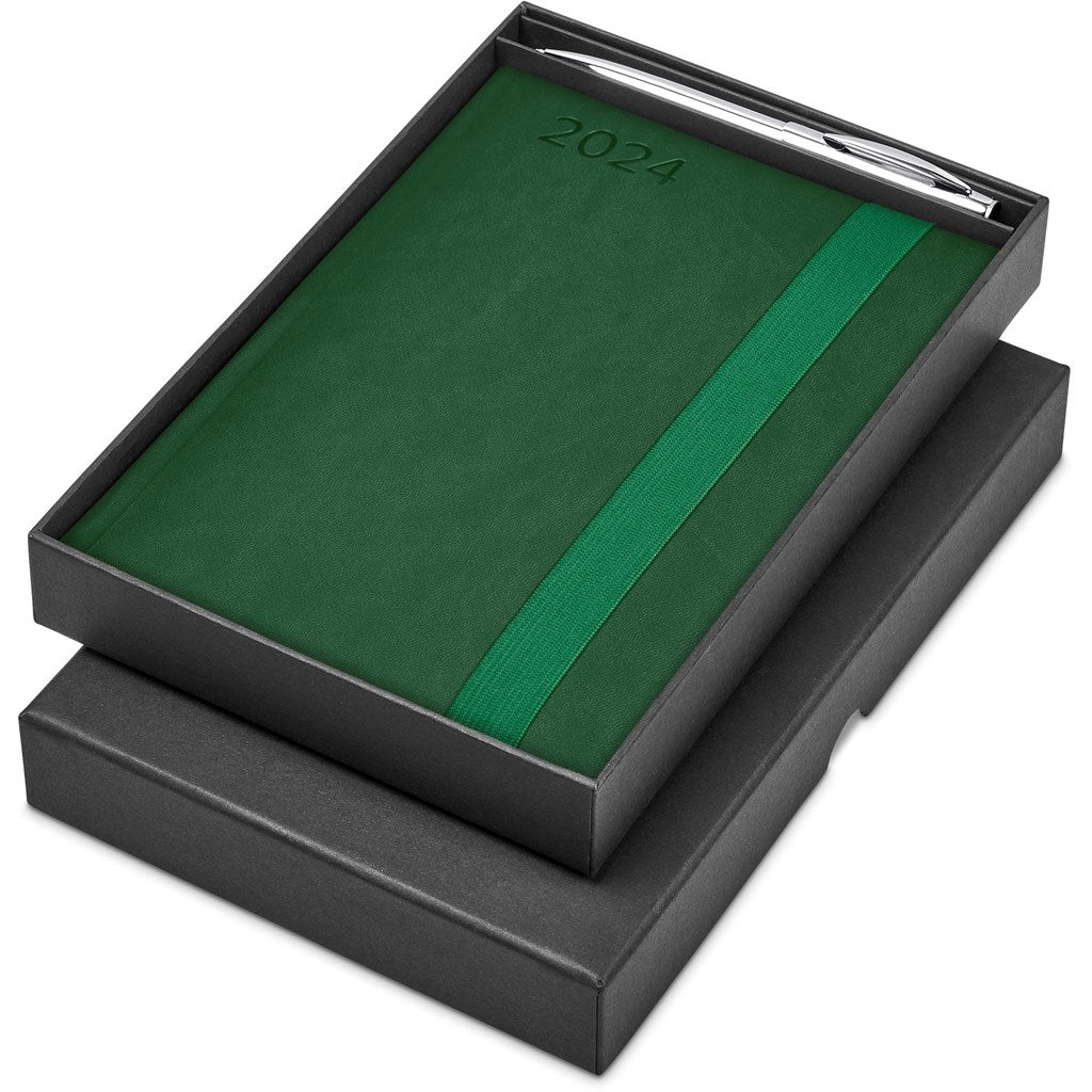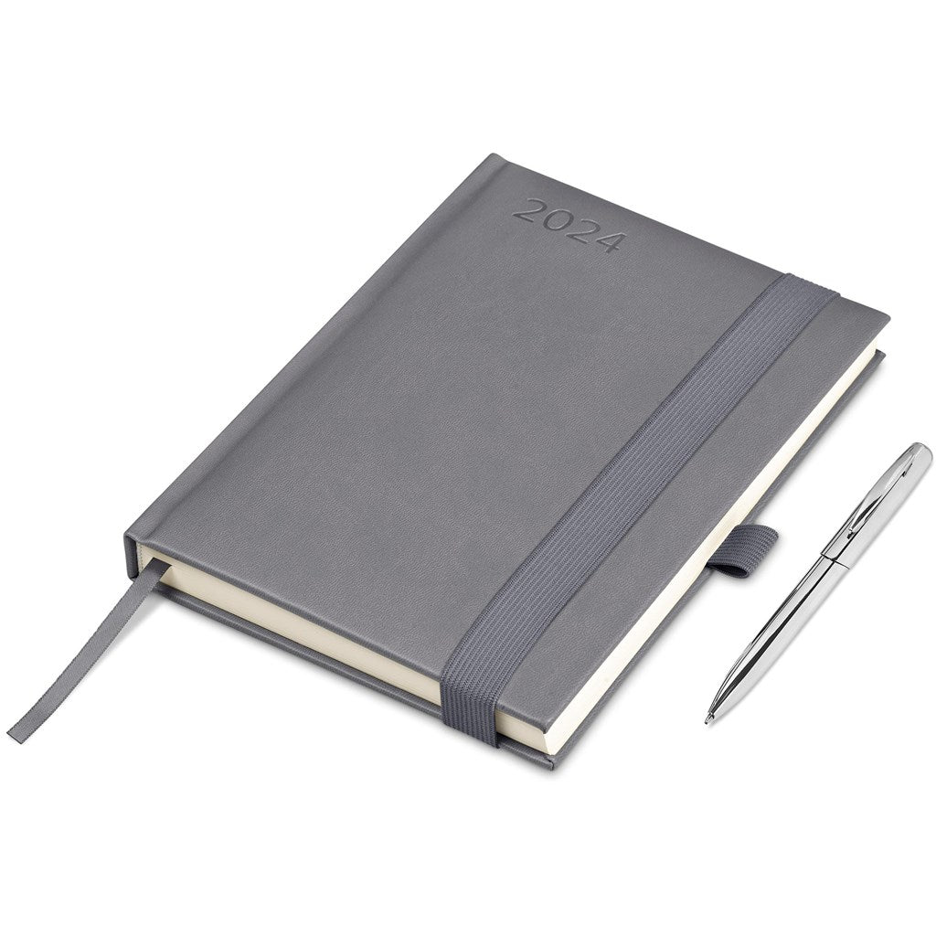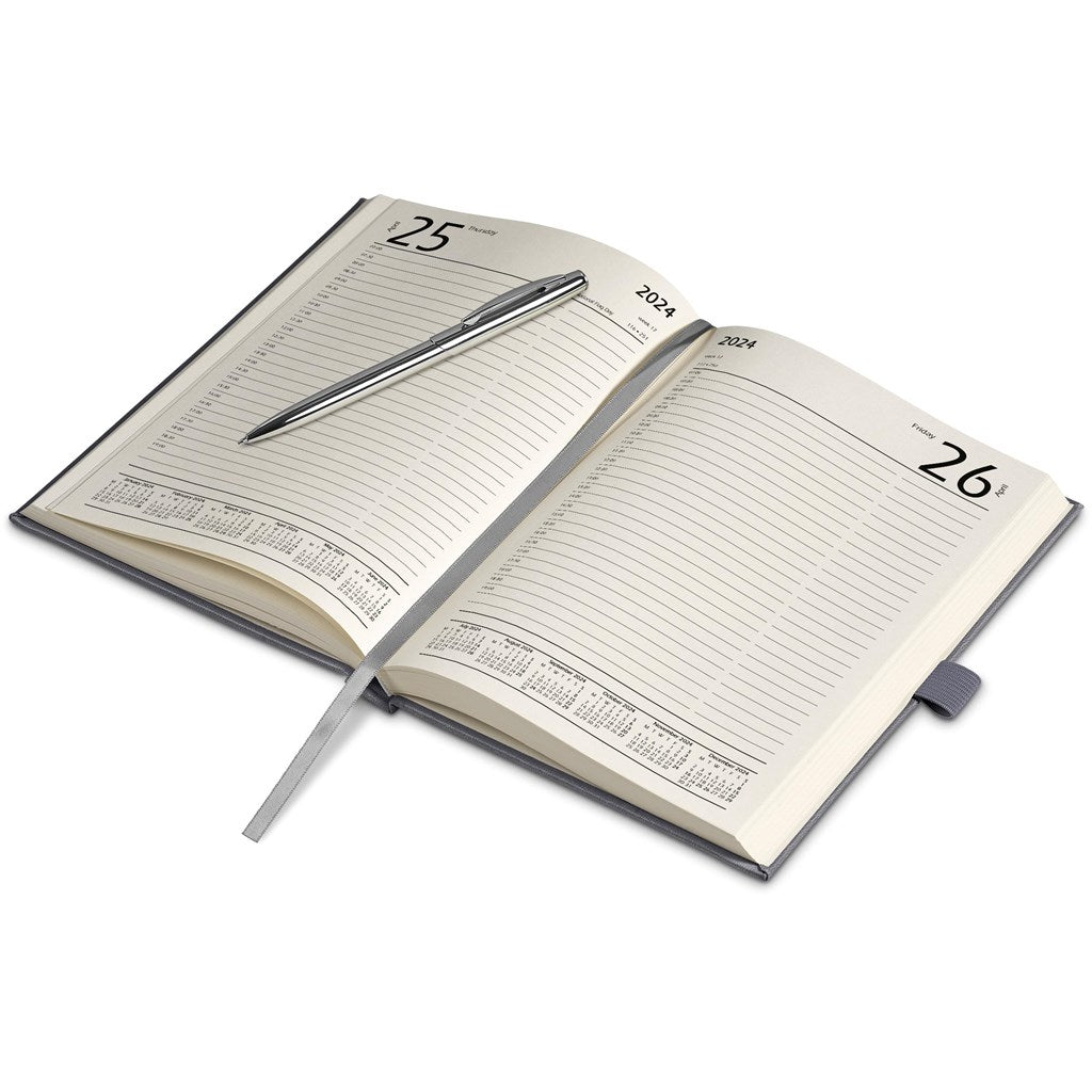 Why not add a ball pen to your diary gift this year? This set includes the Advantage A5 diary and a chromed silver ball pen, packaged together in a matte black, rigid 2-piece gift box.