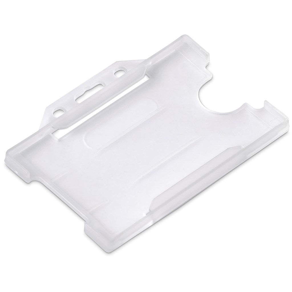 This frosted rigid plastic card holder is designed to hold access cards, and can be attached to the clip of a lanyard.