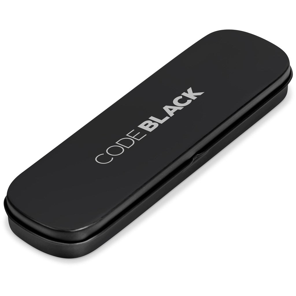 This metal ball pen has a striking carbon fibre look barrel and matte gun metal trims. It's packaged in a black tin box and both the pen and the box can be branded with your logo or message.