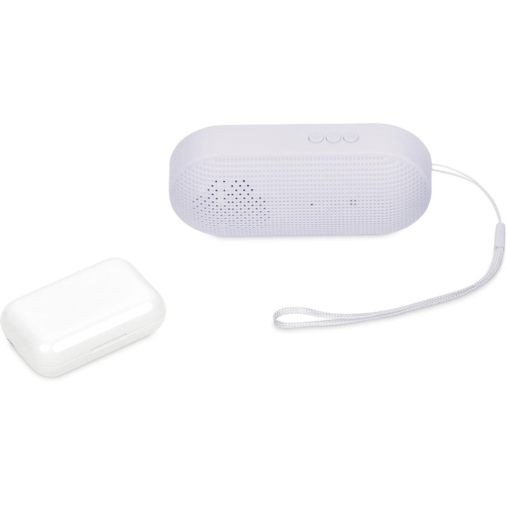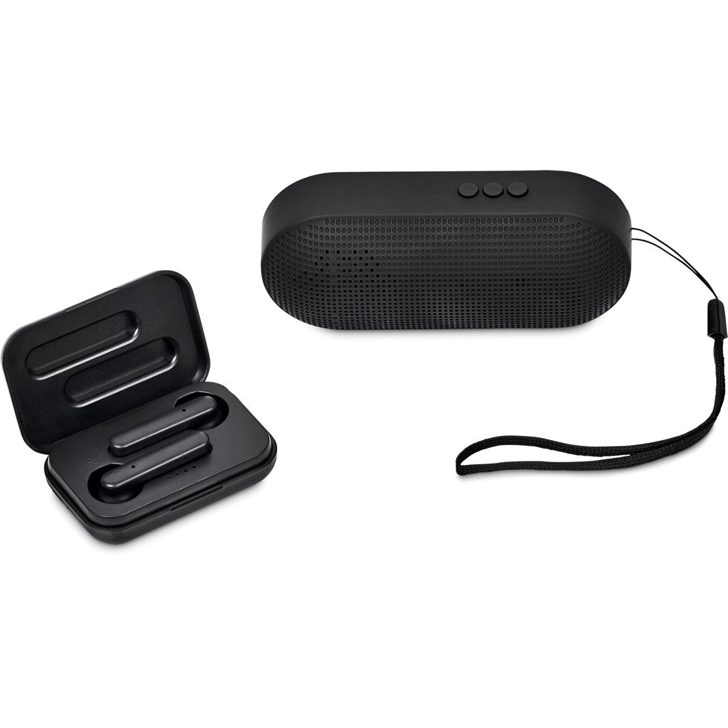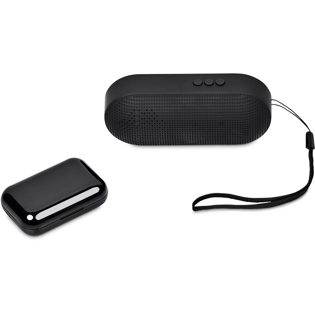 Enjoy your music on your own or with others, with this gift set, which pairs a pair of TWS earbuds with a Bluetooth speaker in a black, 2-piece presentation box.