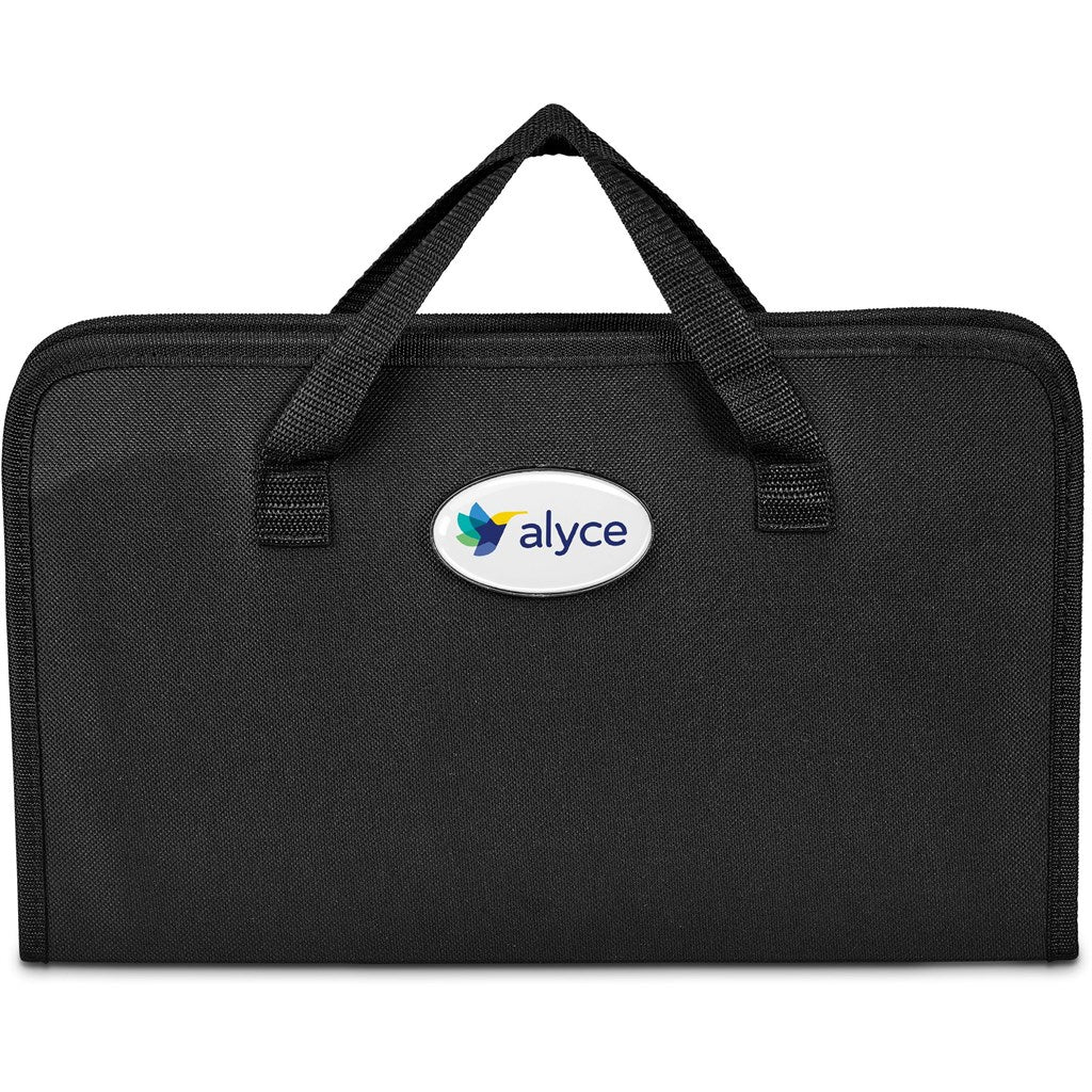 Whether it’s at that self-catering place with the small wine glasses and the blunt knives, or just out at the braai at home, this food prep set is bound to be your new best friend. It features a chef’s knife, a chef’s fork, a knife sharpener and a serrated steak knife on one side, and a wooden cutting board on the other. All are packaged within a rigid bag with a carry handle, and a recess badge for dome branding.