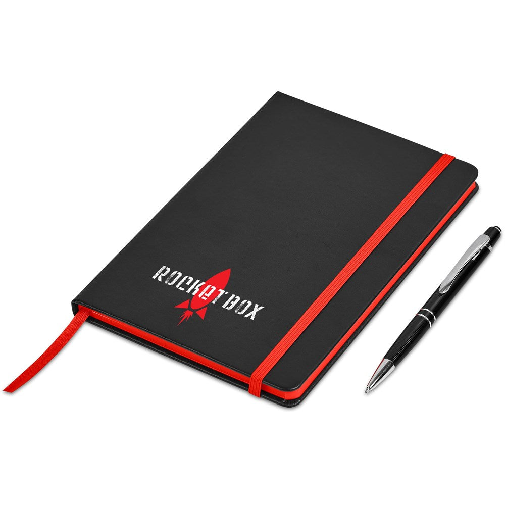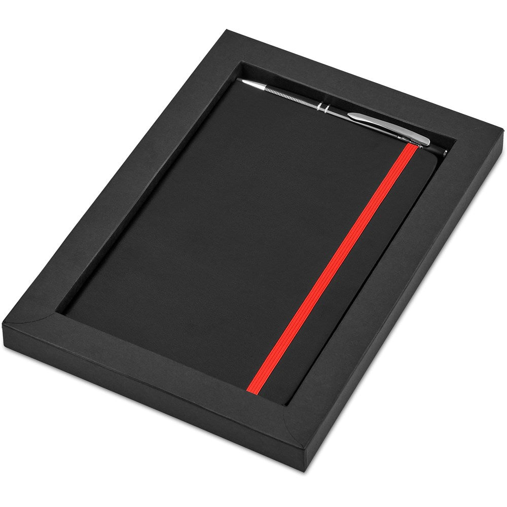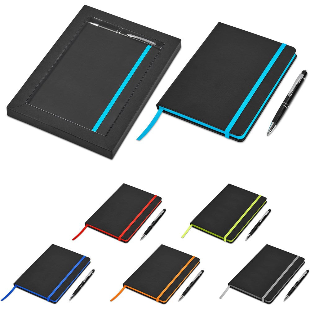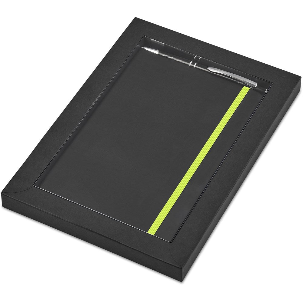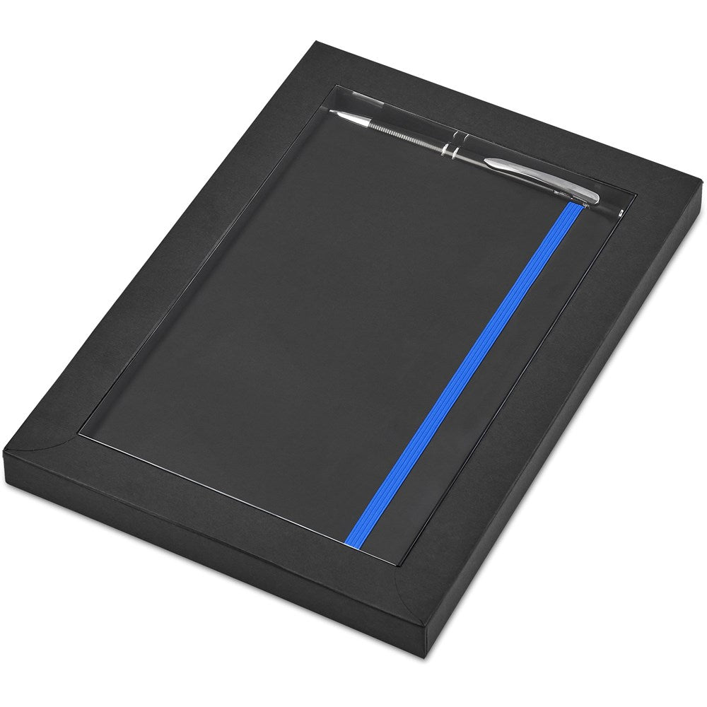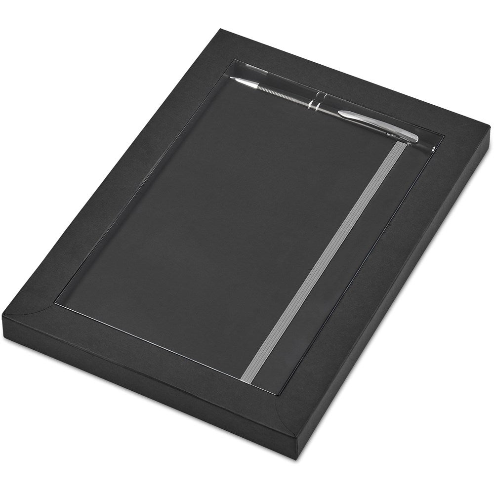 An A5 hard cover notebook with colour page edges is paired with a silver aluminium ball pen, and  packaged together in a box which provides bold and clear exposure for your branding. The box has a firm cardboard base, and a transparent acetate lid.