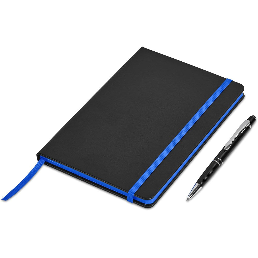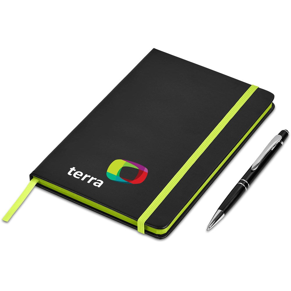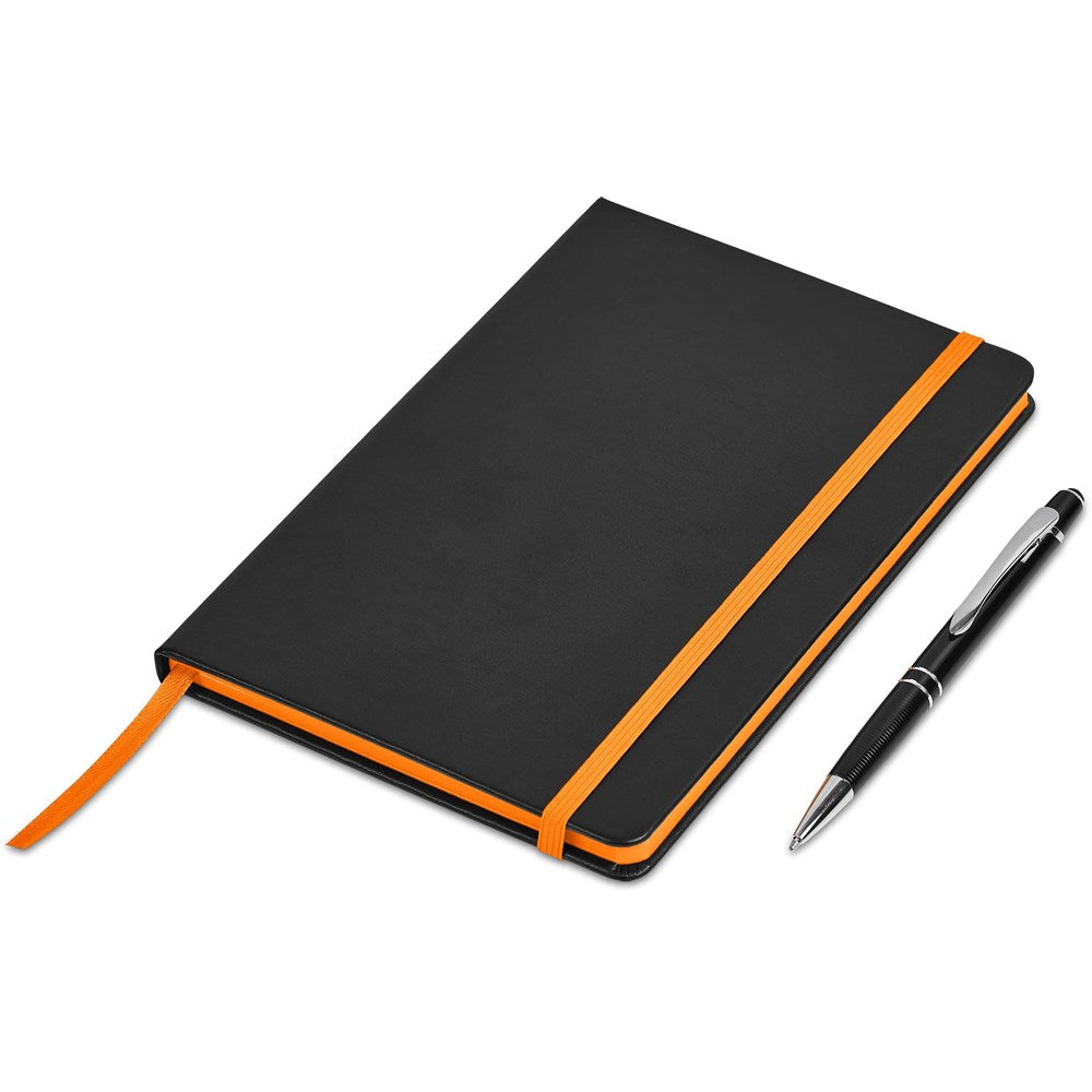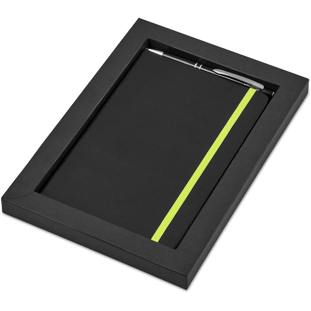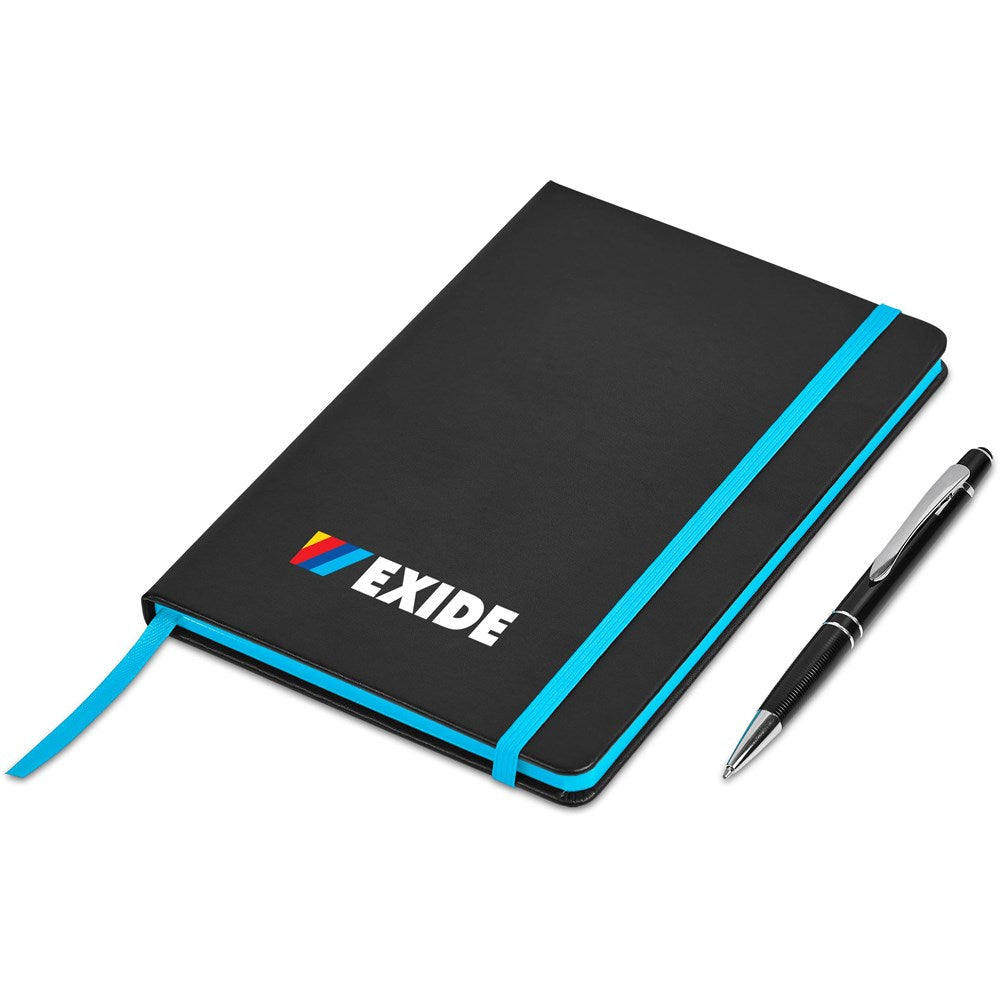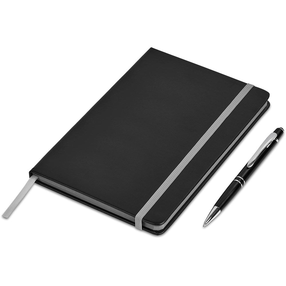 An A5 hard cover notebook with colour page edges is paired with a silver aluminium ball pen, and  packaged together in a box which provides bold and clear exposure for your branding. The box has a firm cardboard base, and a transparent acetate lid.