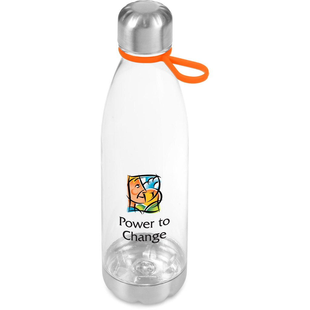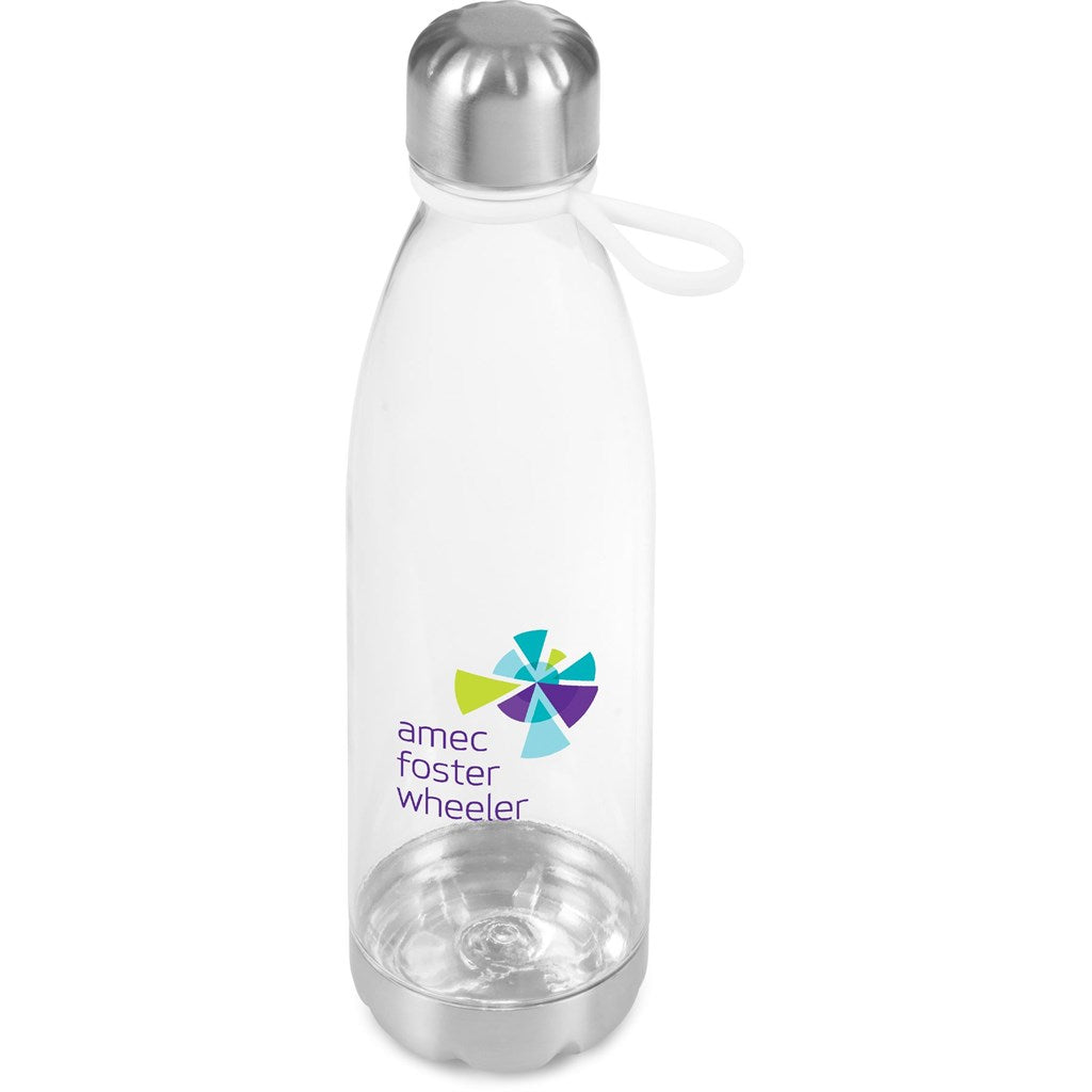 This large, clear water bottle has a silicone finger loop, which makes it easier to carry. The loop gives the bottle a colour accent which is most effective with a matching colour printed logo on the bottle.