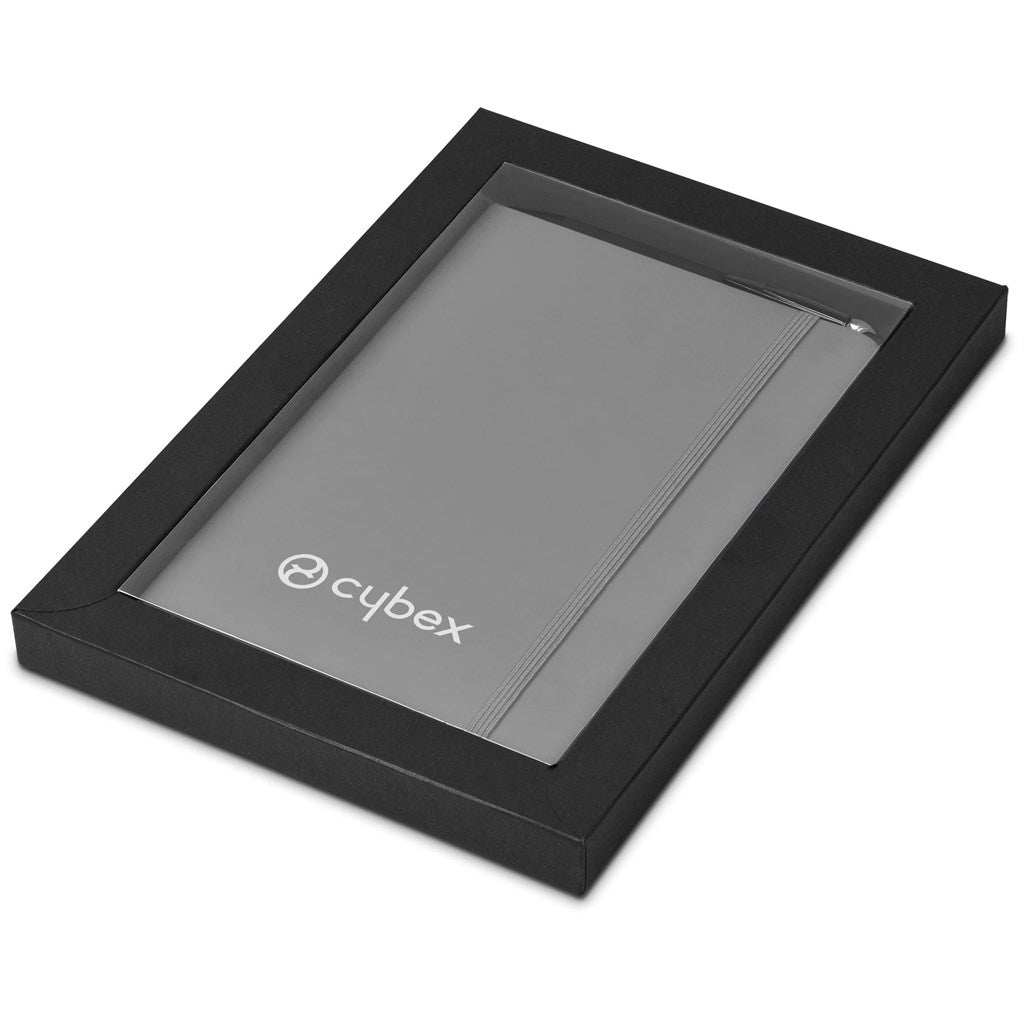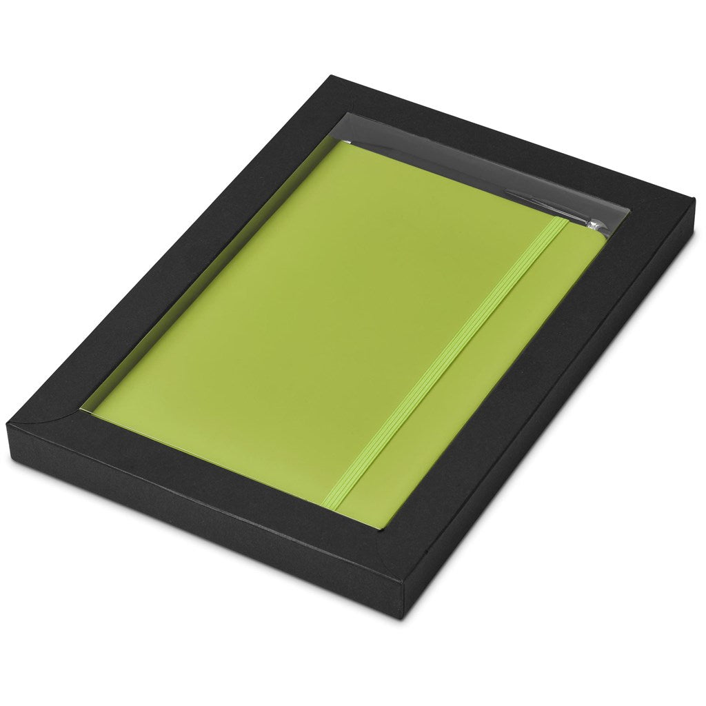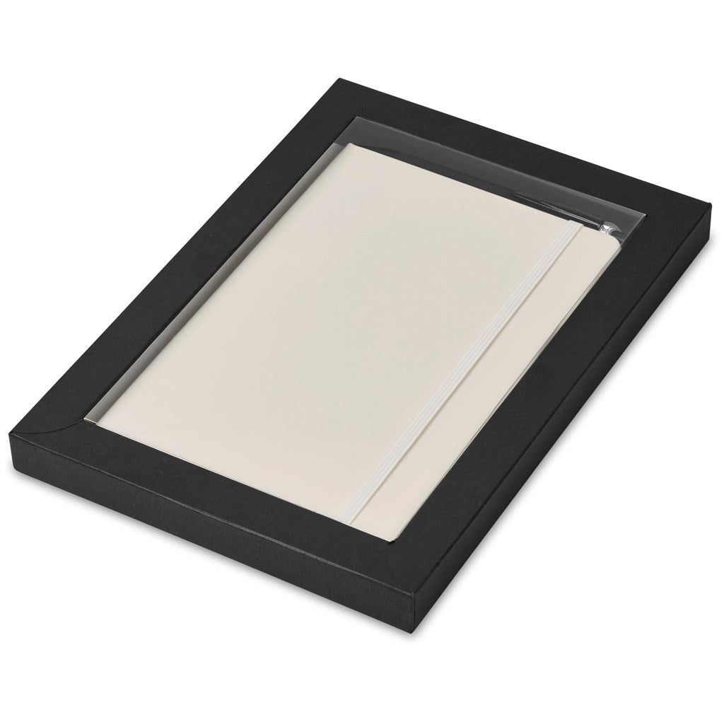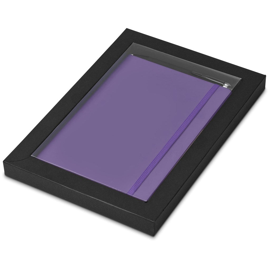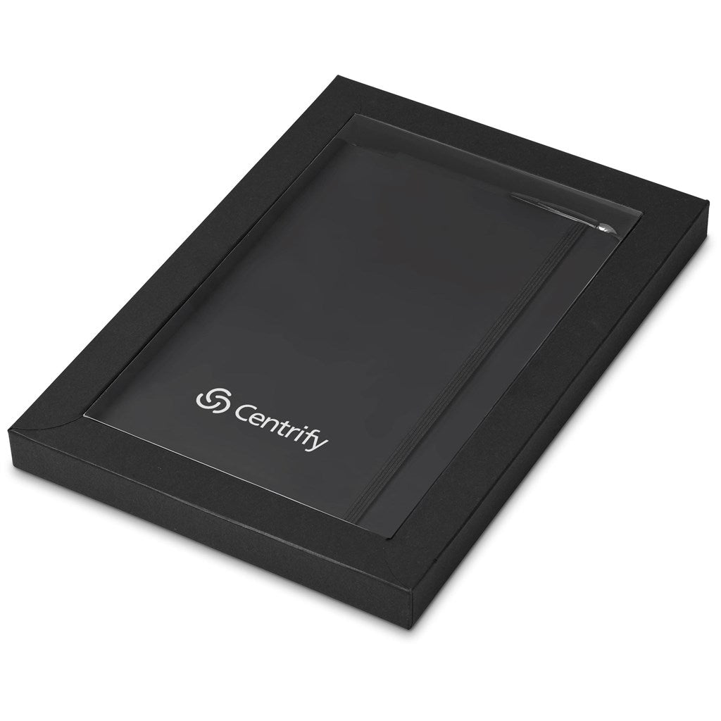A notebook in a choice of colours and a black, aluminium ball pen are packaged together in a box which provides bright and clear exposure for your branding. The pen has a matte finish, with a silver underlay, which is exposed when your logo is lasered into the pen.The box has a firm cardboard base, and a transparent acetate lid.