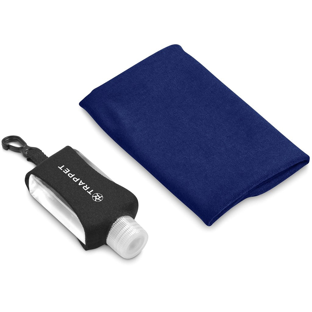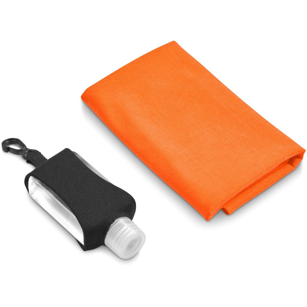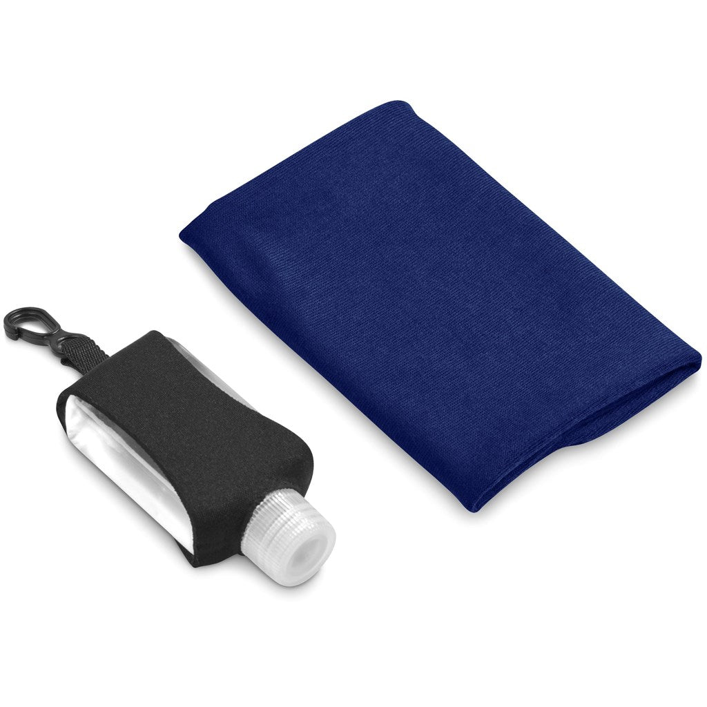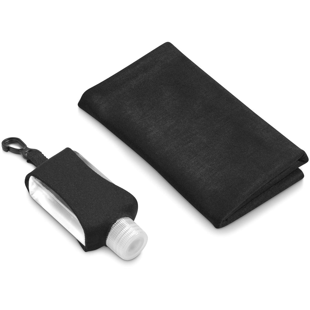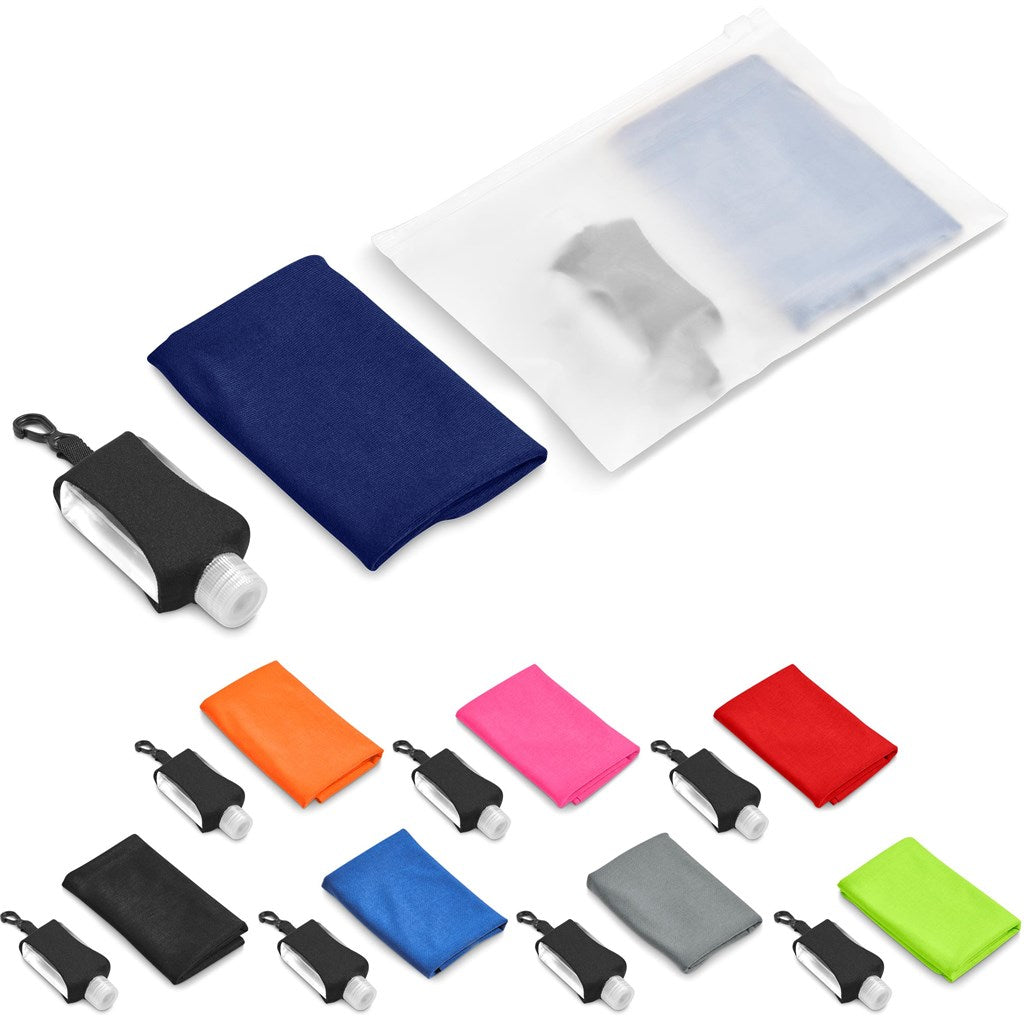 The multi-purpose pack. Consists of a tubular bandana to be used in replacement of a mask and a 50ml bottle of hand sanitiser in a lanyard pouch with a carabiner, this item can be clipped on to your lanyard at events, on to your belt loop or school bag, so you always have hand sanitiser on the go, all packaged together in a pouch to get your brand logo on the move. The 50ml hand sanitiser has Tea Tree Oil which colours the liquid with a slightly yellow hue.