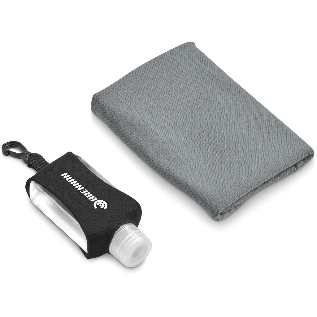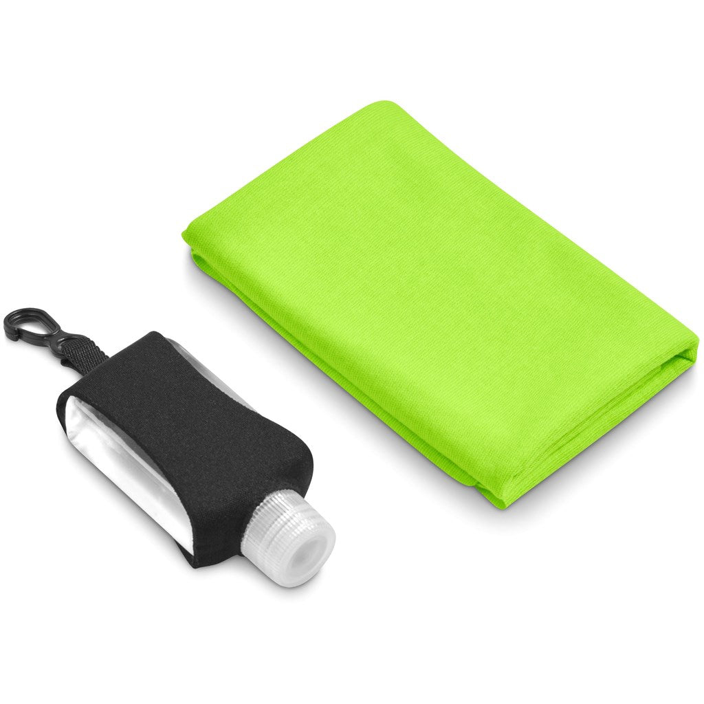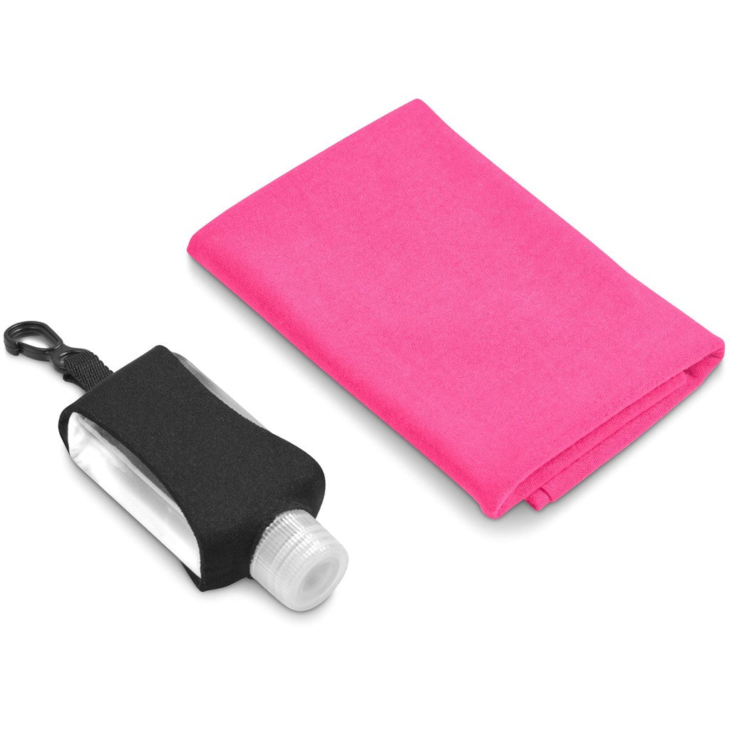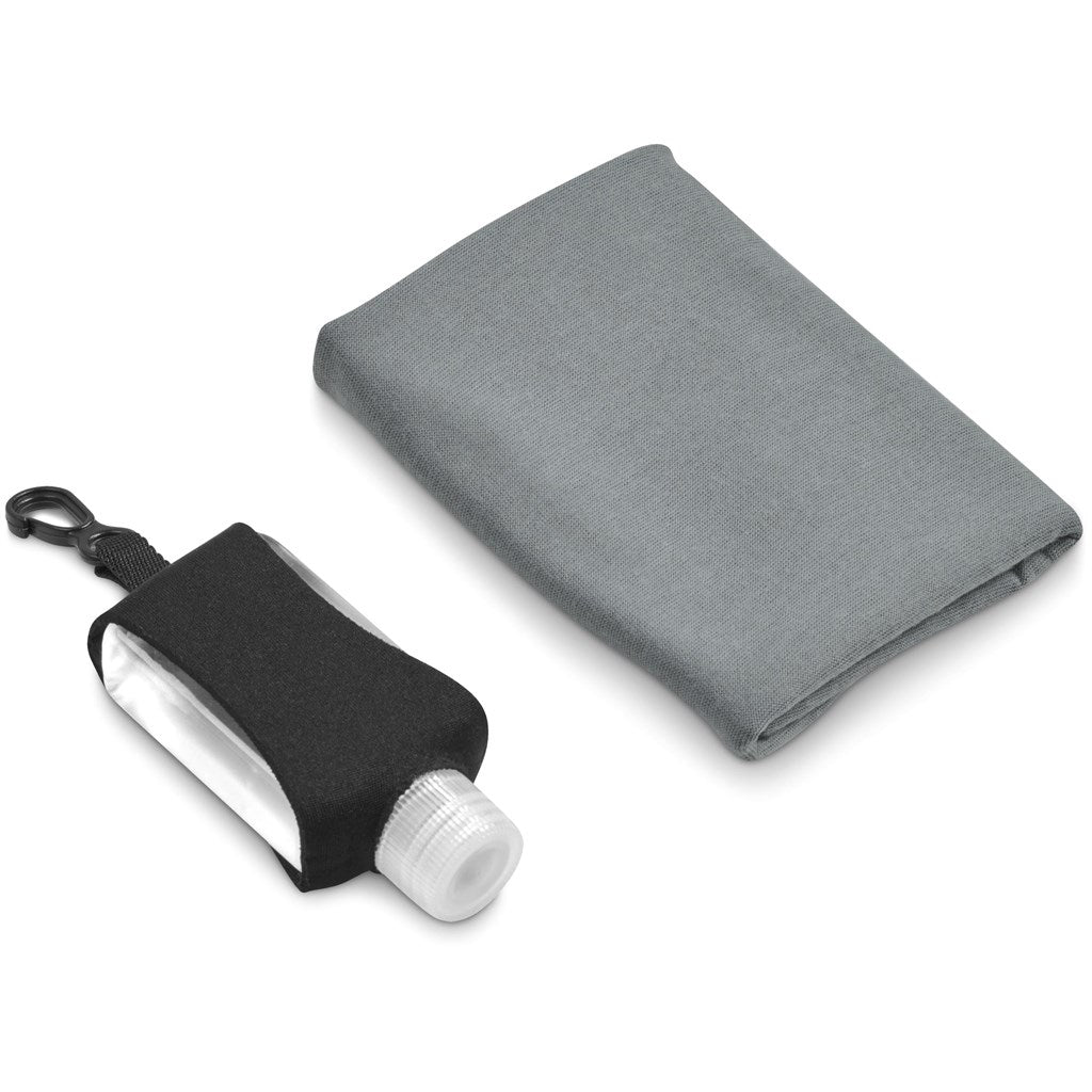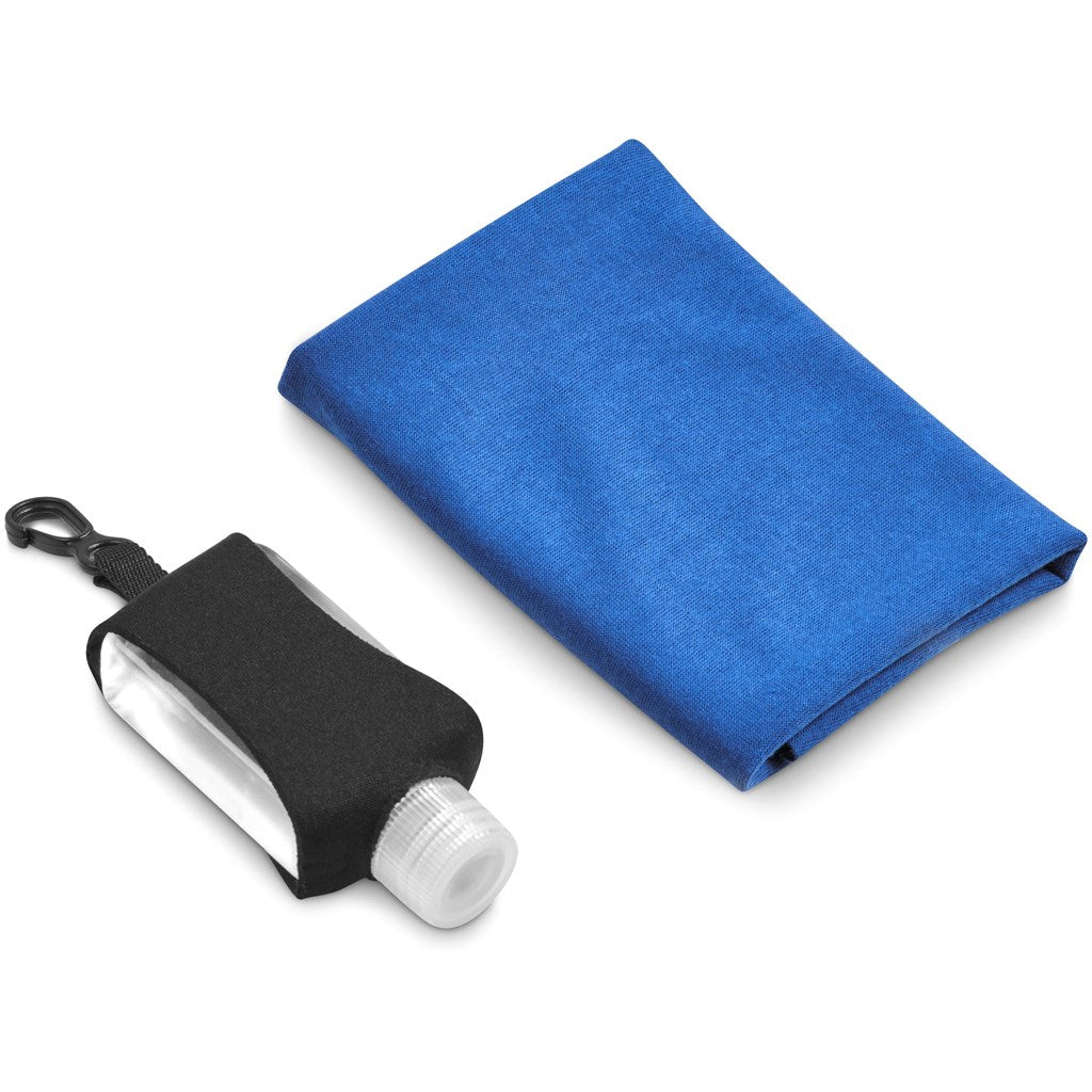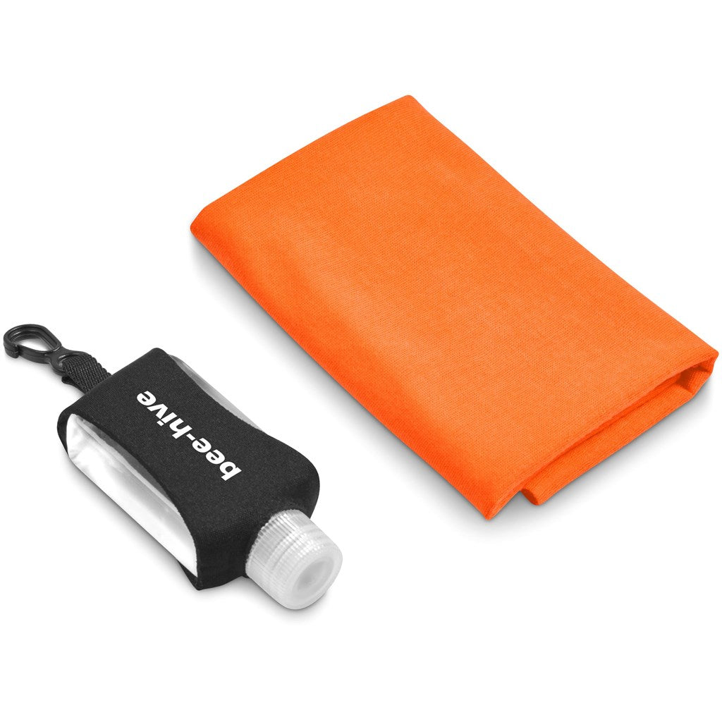 The multi-purpose pack. Consists of a tubular bandana to be used in replacement of a mask and a 50ml bottle of hand sanitiser in a lanyard pouch with a carabiner, this item can be clipped on to your lanyard at events, on to your belt loop or school bag, so you always have hand sanitiser on the go, all packaged together in a pouch to get your brand logo on the move. The 50ml hand sanitiser has Tea Tree Oil which colours the liquid with a slightly yellow hue.