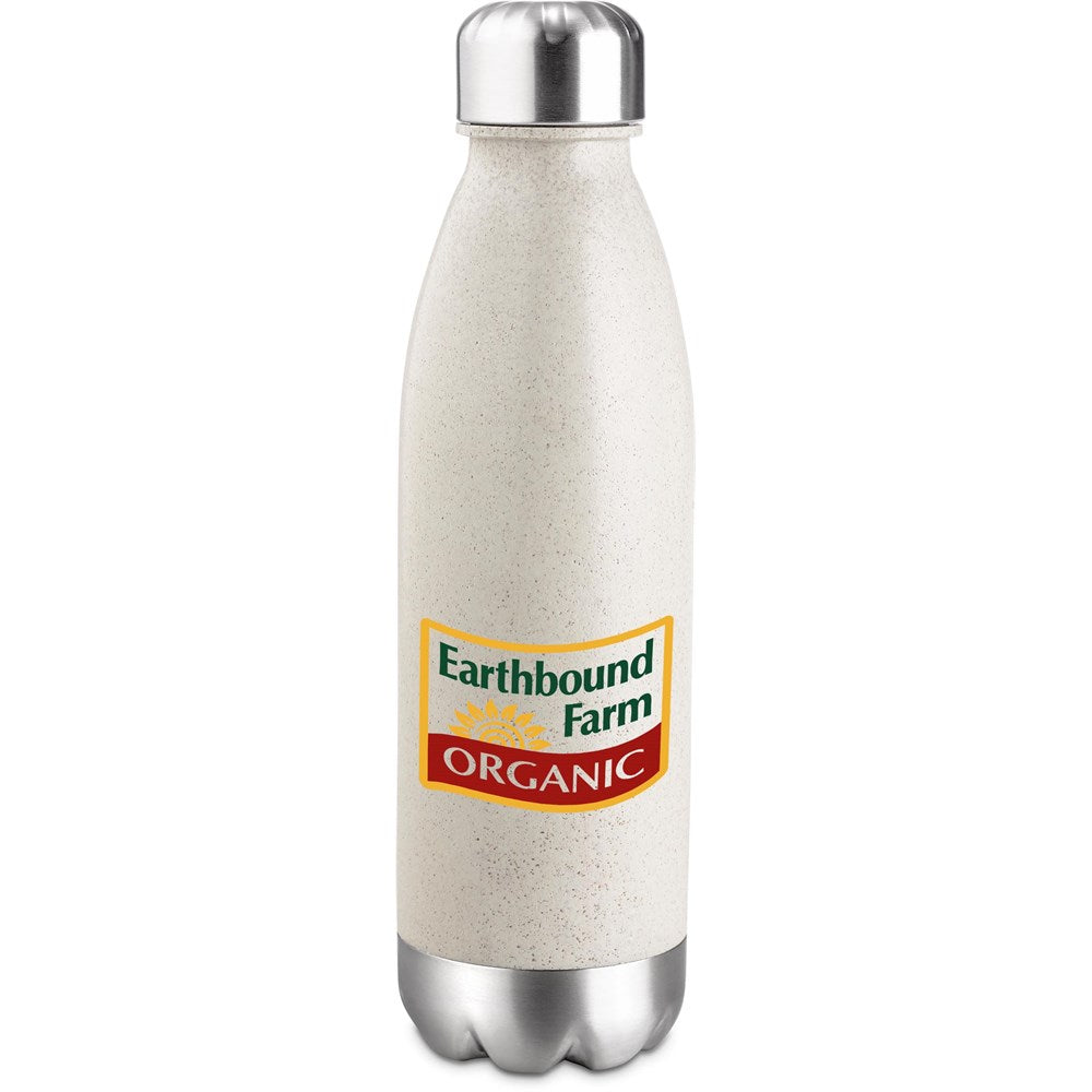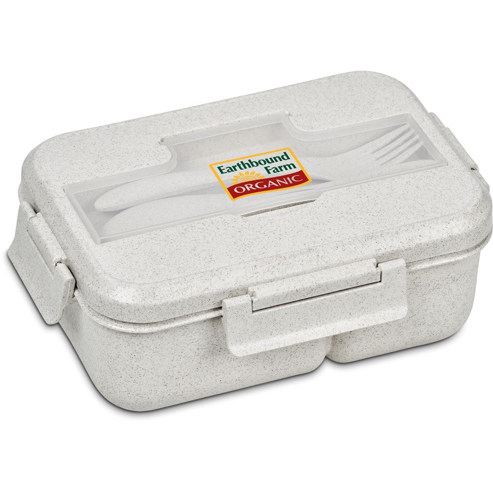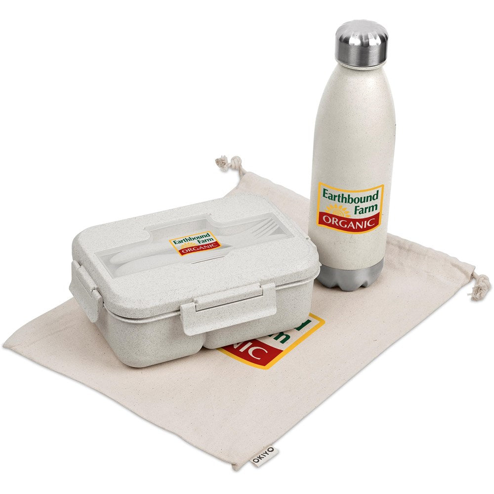 A water bottle and a snap-lock lid lunch box, both made partially from wheat straw material, are paired up in a drawstring bag made from natural cotton. Natural wheat straw is mixed in with plastic, to reduce the amount of plastic needed to make the bottle and food container.