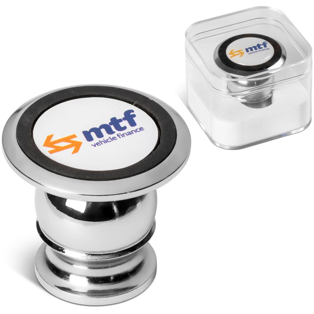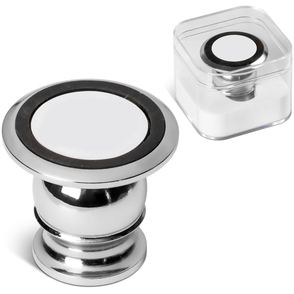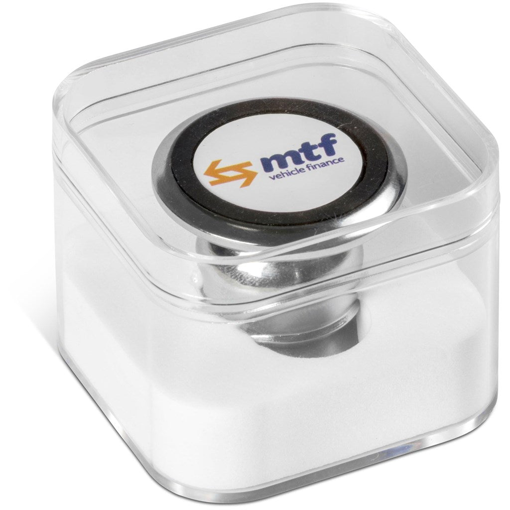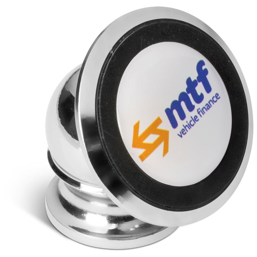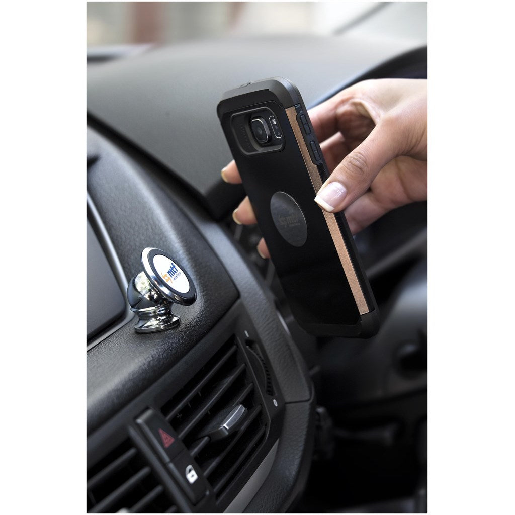 Undoubtedly the safest way to access your phone whilst on the road! Our Safe-Travels Mobile Mate magnetic car mount attaches to any smooth surface of your dashboard. With its 360 degree rotating head, it allows you to keep your phone safely in view at eye level while keeping your hands free and you focused on the road. Simply attach one of the two metal plates, which come in 2 different sizes, to your phone or phone cover and attach to the magnetic car mount to secure your phone in place. Laser engraving can be applied to the plates supplied.