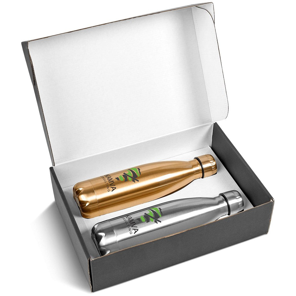The Discovery Double Wall Vacuum Bottle will keep your water cold for hours, even if it's left out in the sun. Here you get a silver bottle and a gold bottle, so you and your partner can each enjoy the benefits of a stainless steel bottle with insulating vacuum construction.