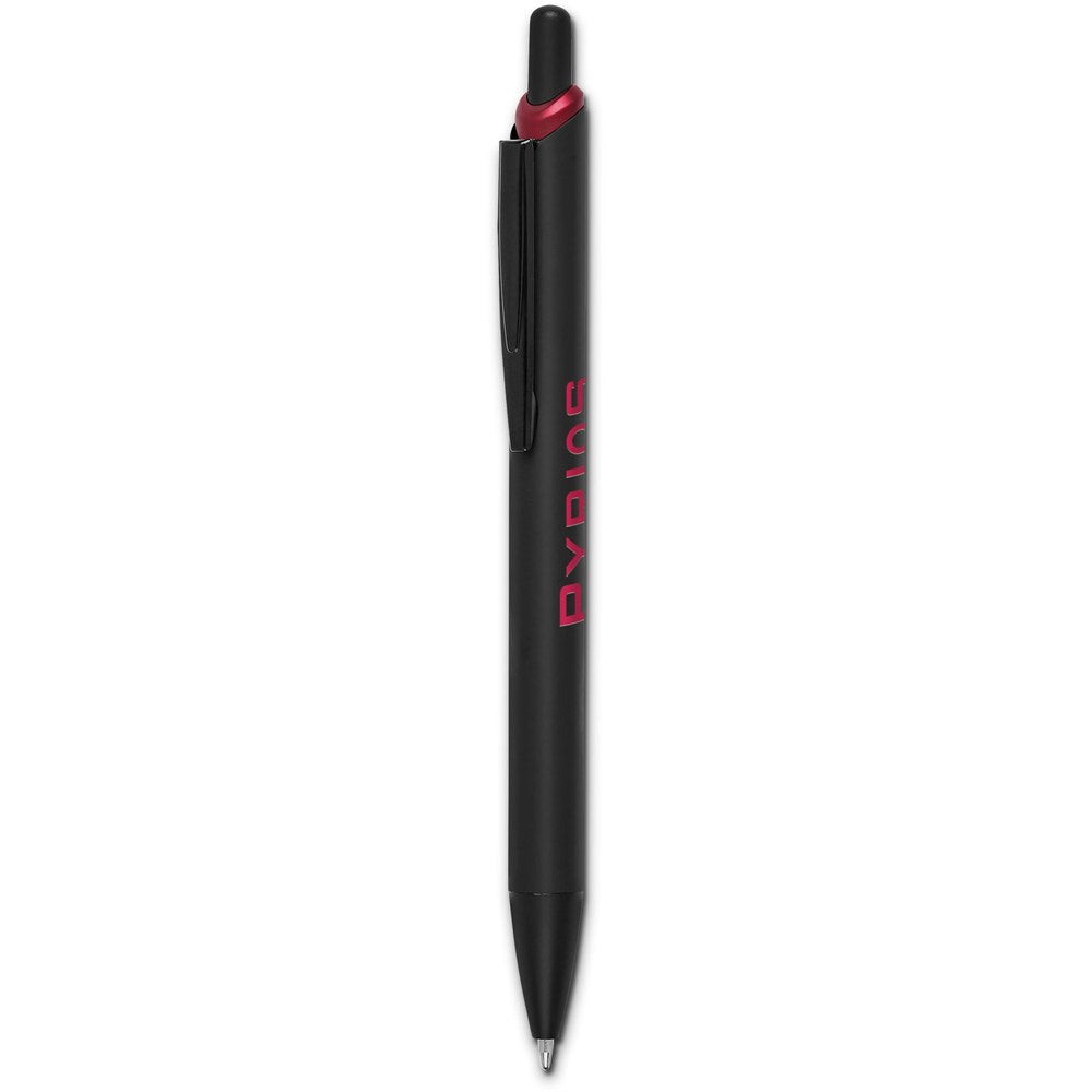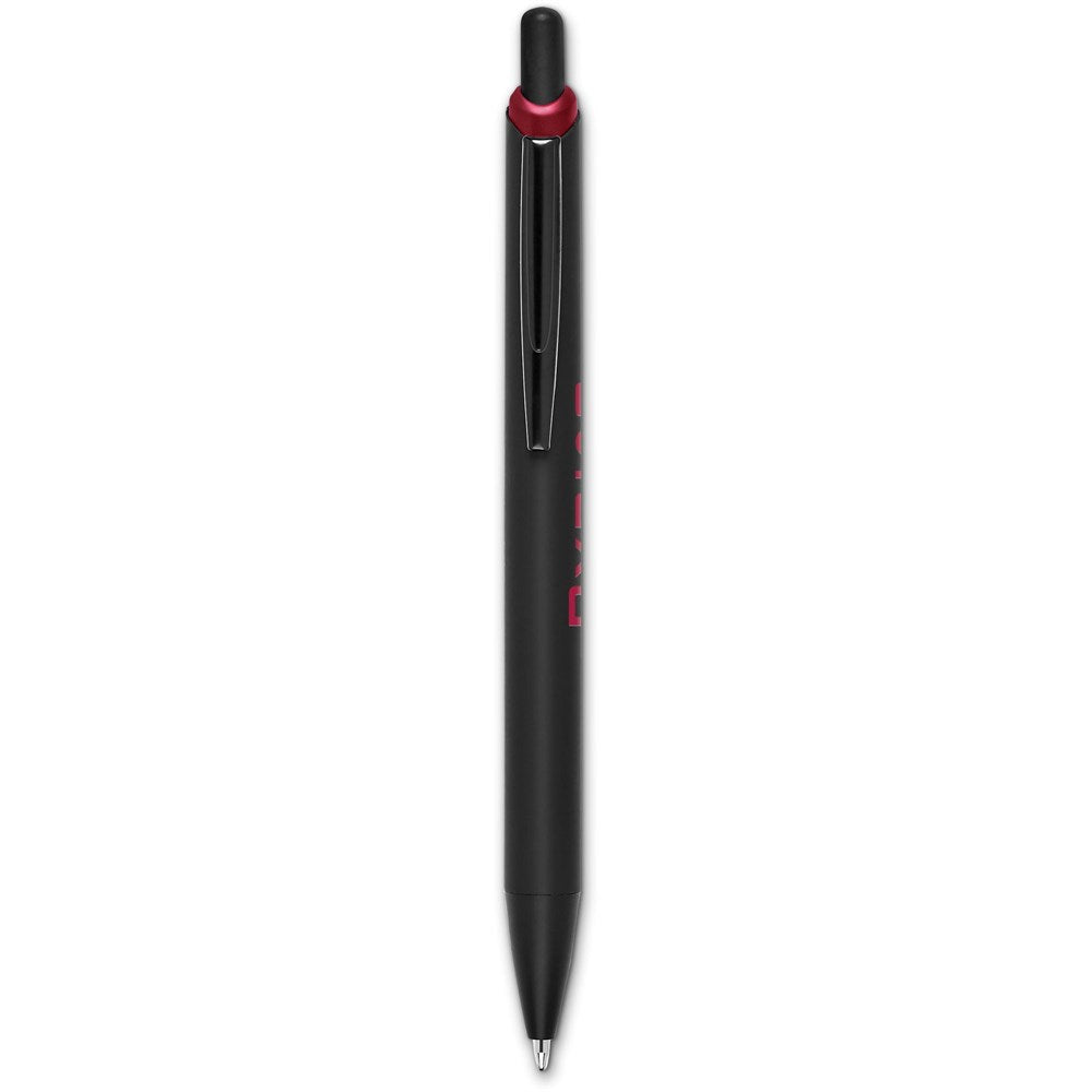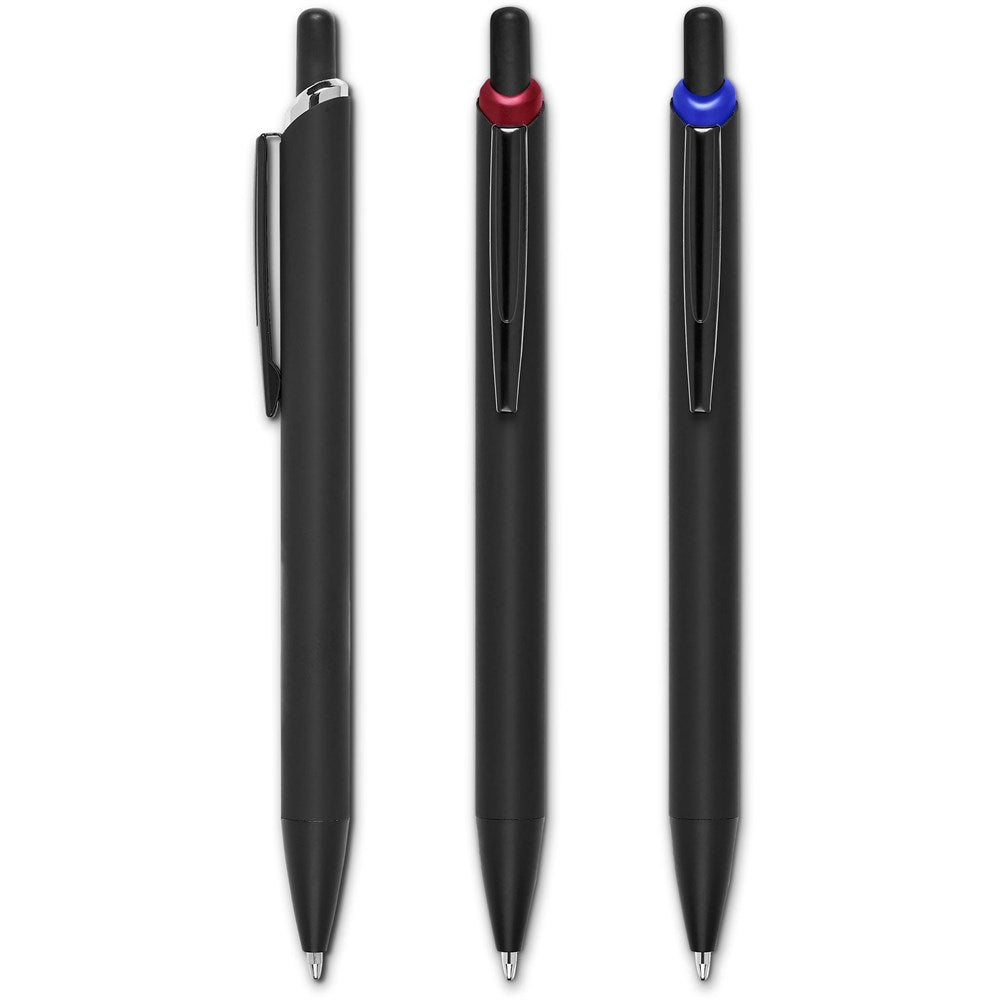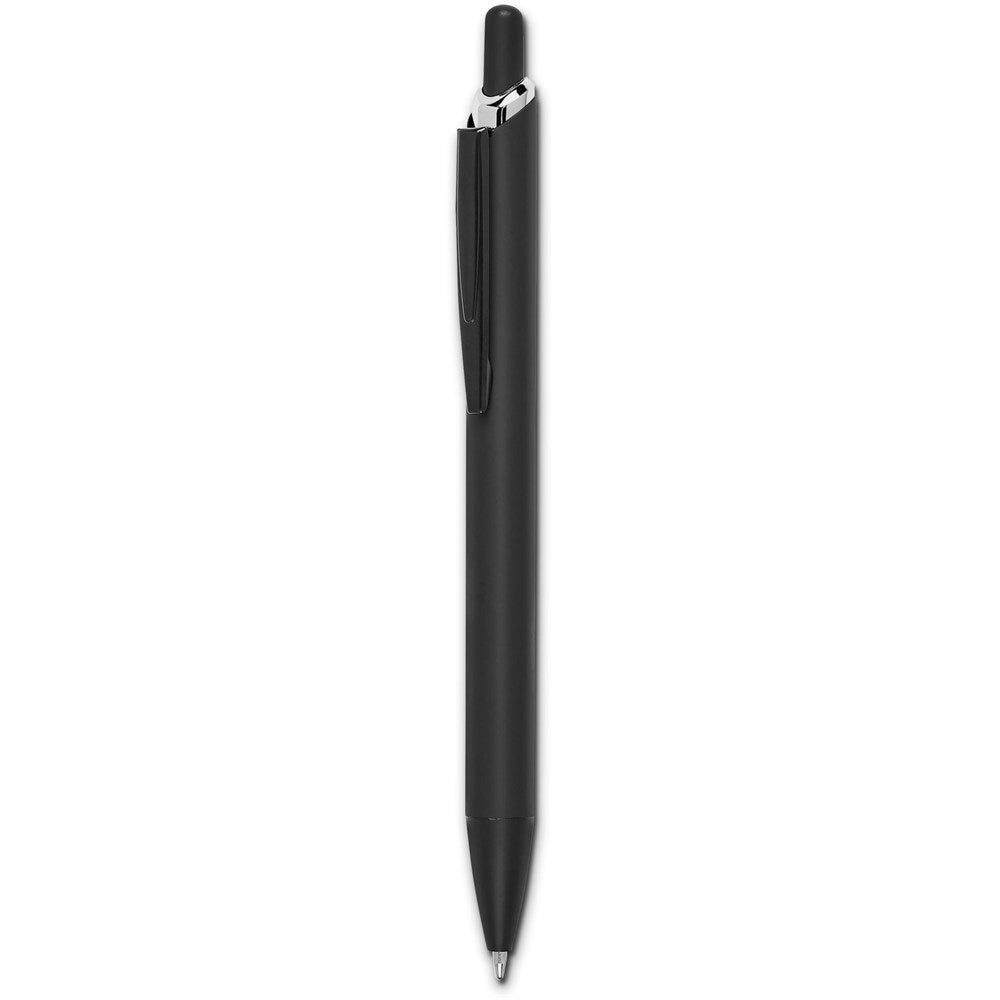 This metal ball pen has a matte black top coating with a chrome underlay. The shiny underlay matches the trim accent of the pen, and is revealed when your logo is engraved on the barrel. The ball pen refill contains good quality, black German ink and will provide smooth, uninterrupted writing for a minimum of 1,500 metres.