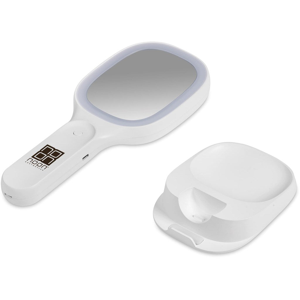 - portable LED double-side makeup mirror, wireless charger & phone holder.