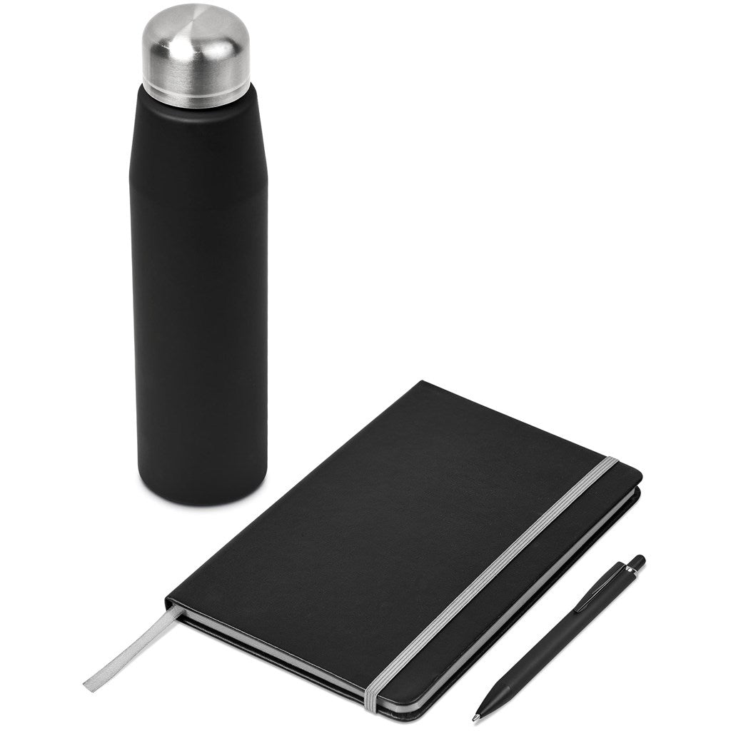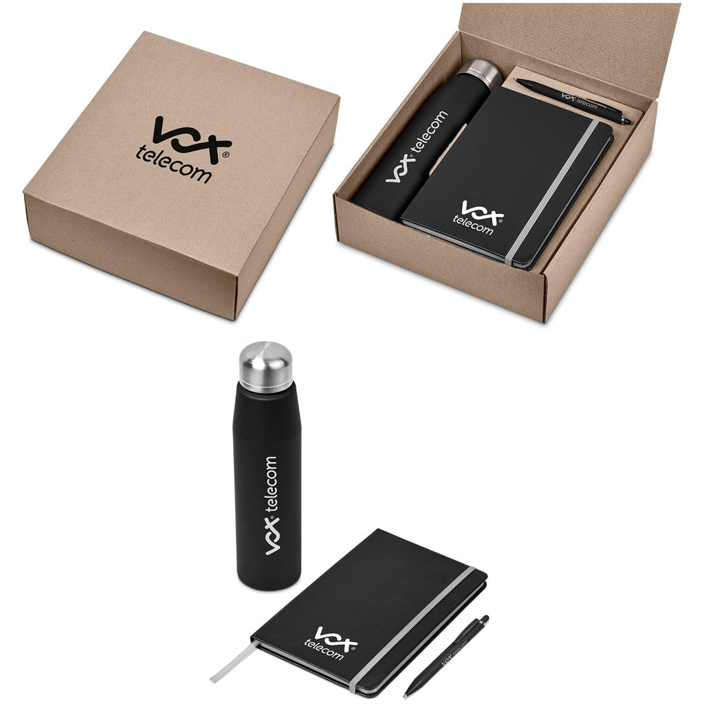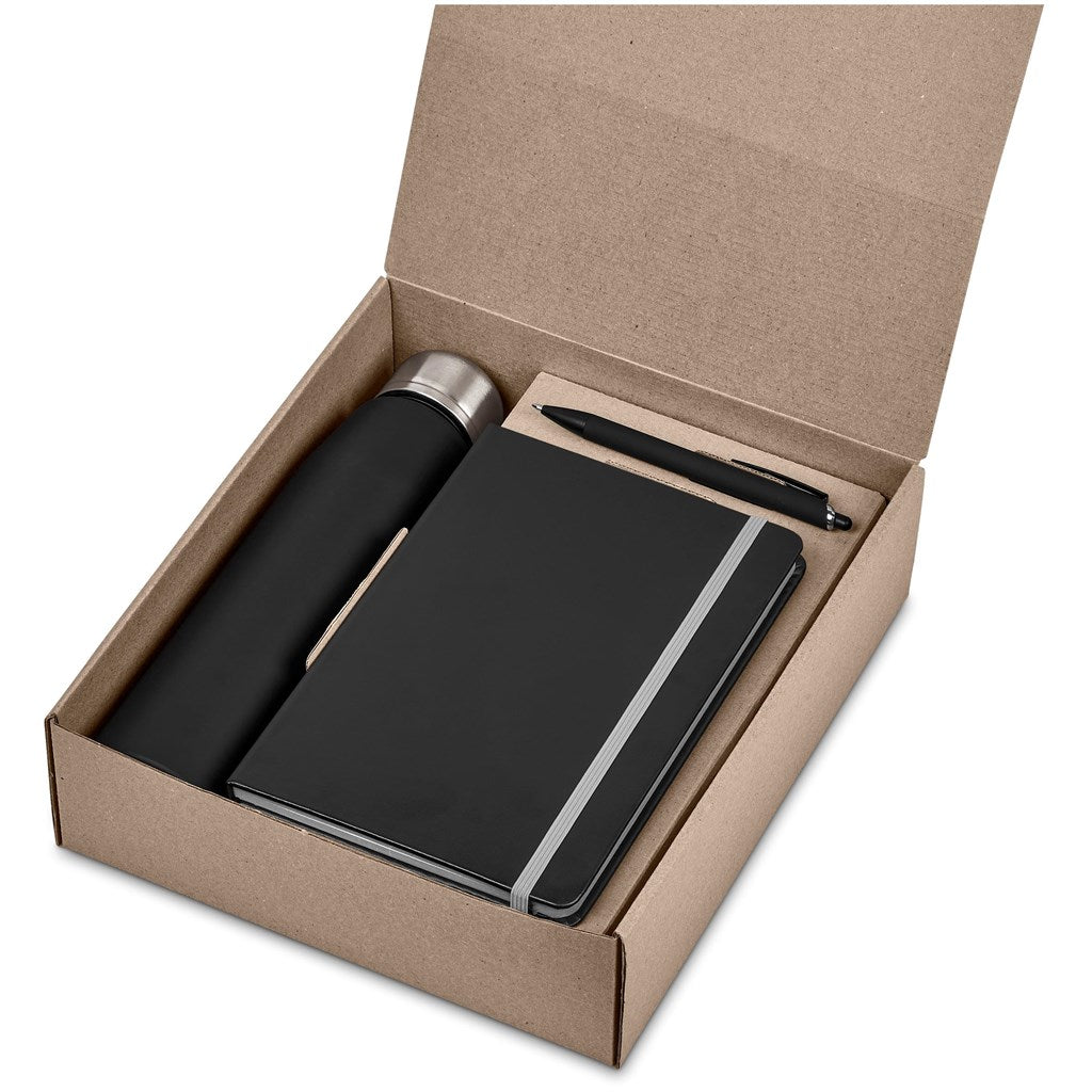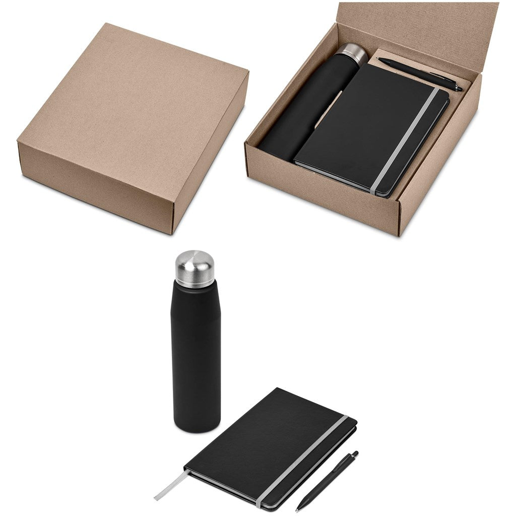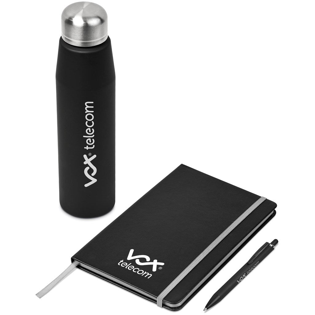 An aluminium bottle with a black, rubberised finish, a notebook with grey page edges and a ball pen are neatly presented together in a gift box. The pen has a matte finish with a silver underlay, which is exposed when your logo is lasered into the pen. This set is suitable as a client gift, or for staff and onboarding of new members to the team. A pre-packaged gift set not only looks impressive, but can also be a convenient and practical option when it comes to transport and delivery.